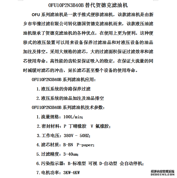 OFU10P2N3B40B賀德克移動濾油機
