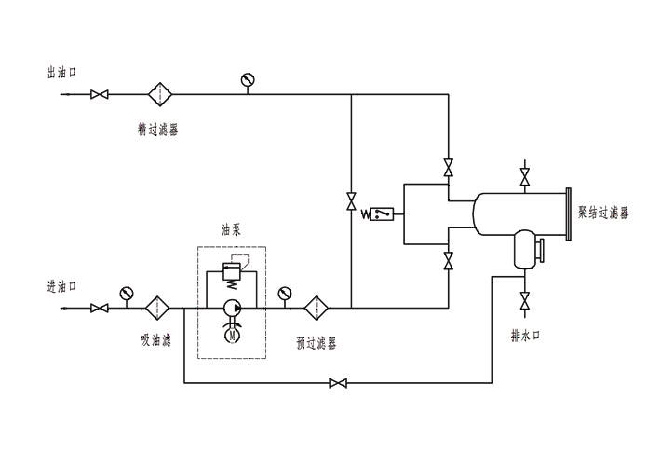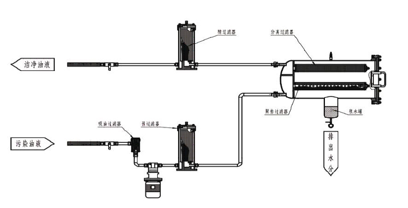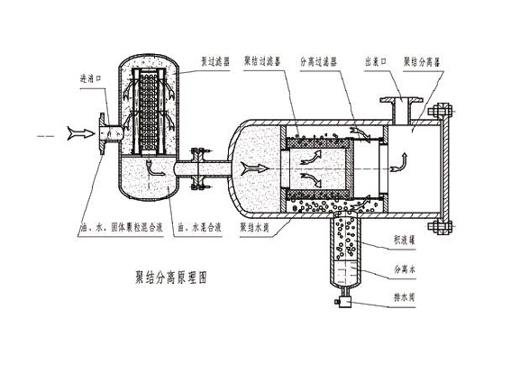 分離系統的分離濾芯由特殊的疏水材料制成,油液通過濾芯時,水珠被擋在濾芯的外表面,相互聚結直至因重力作用,沉降至儲水罐內。